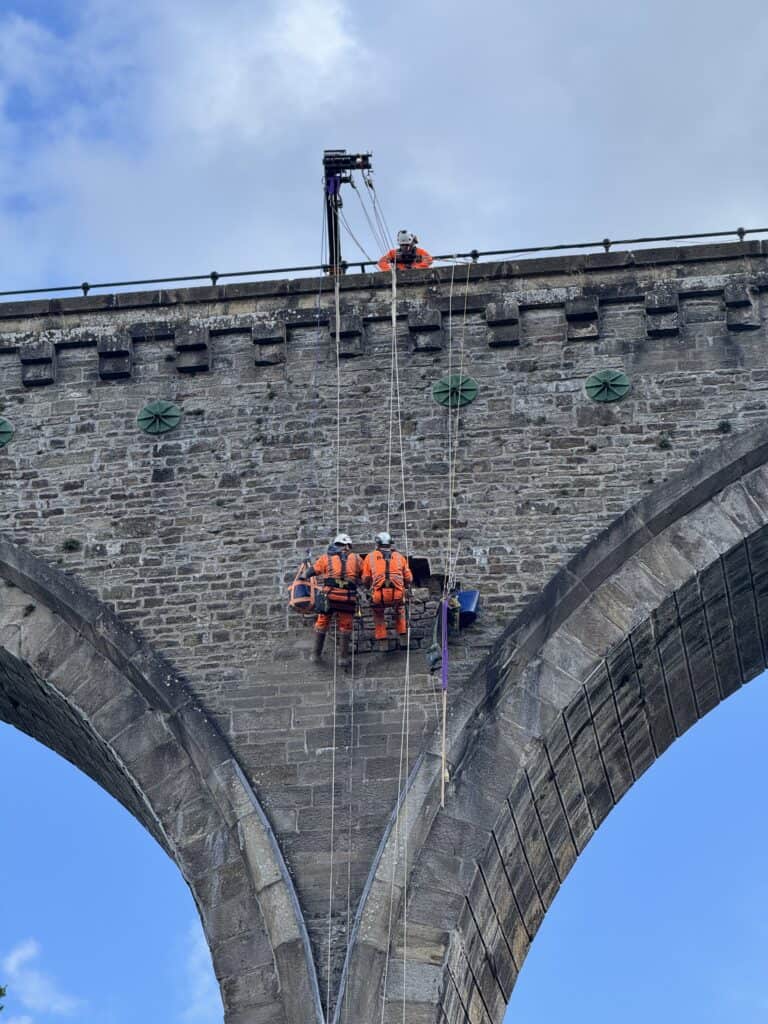 Having already worked with the South Tynedale Railway Preservation Society on other structures on the line, Bell Access were asked to assist with the repair of the missing stonework. On an initial site visit, it was decided that an inspection by the engineering architect firm Blackett-Ord was required. We returned to site a few weeks later, and used our JCB 514-40 micro tele-handler as a high anchor point for the rope system. Our Skylotec Actsafe ICX power ascender was utilised to safely lower the non-rope access engineer to the defect, and then smoothly raise them back up to the bridge deck.